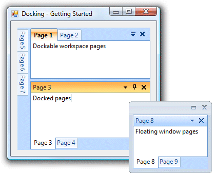 Finally line four adds a floating window that shows two pages in tabbed appearance. Just call AddFloatingWindow and provide the name of element that was just in the ManageFloating call along with an array of pages to be added. You can see the created floating window at the bottom right corner of Figure 1.