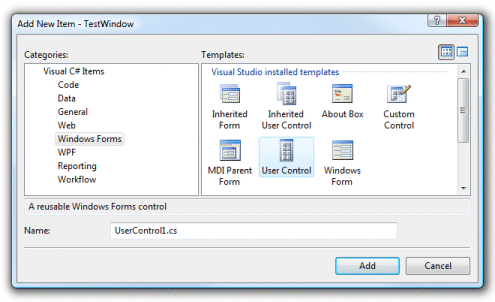 The advantage of this approach is that you can now modify the contents of the page by double clicking the user control class and using the designer to drag and drop controls as needed. In practice you would probably want to use more appropriate names for the user control and page class rather than the defaults. For example 'UserControlProperties' in place of 'UserControl1' and 'PropertiesPage' in place of 'Class1' would be more readable if creating a docking page for showing a set of property values.