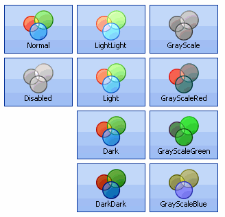 The most commonly used enumeration values are the Normal, which just shows the image without any change, and Disabled which shows the image is a washed out appearance suitable for a disabled control. You can lighten or darken the image by using one of the Light, LightLight, Dark and DarkDark options. There are four options for performing gray scaling. GrayScale will convert all colors into black and white whilst GrayScaleRed, GrayScaleGreen and GrayScaleBlue convert all except the nominated color into gray scale. See figure 11 to see all the enumeration options applied.