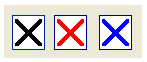 When the image is being painted you can remap one of the image colors to an alternate. Use the ImageColorMap to specify the color you want to alter and use ImageColorTo to define the new output color. This is useful if you have just a single color image and want to alter the display color based on the tracking or pressed state. Figure 12 shows a black cross image in three colors. The left most image is the original Image without any color re mapping applied. In the second image the ImageColorMap = Black and ImageColorTo = Red. Last is the blue image which also has ImageColorMap = Black but ImageColorTo = Blue.