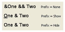 Prefix has three possible values that determine how to process the ampersand character inside the text string. None specifies that no pre-processing of ampersand characters take place so the output is the exact string provided. Hide will process ampersand characters but will not underline the output text. Show will process ampersand characters and place an underline under the next character. Figure 19 shows the each of the three options.