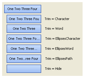 Finally the Trim property is used to specify how to handle text when there is not enough room to display it all. If you would like the text to disappear then use the Hide option. Alternatively you can use the Character or Word options to remove the excess characters or words that that will not fit. If you would like the user to be made aware that truncation has taken place then use one of the ellipses options EllipsesCharacter, EllipsesWord or EllipsesPath. Figure 21 shows the various options in action.