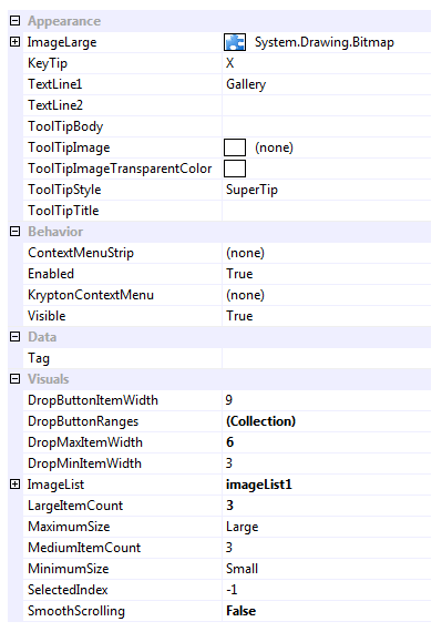 This property must always have a valid image defined. If you assign null to the properties then it will automatically revert to a default Krypton Toolkit logo image instead. Once the gallery is in the small setting it replaces the gallery appearance with a button appearance and this image is used in the button appearance.